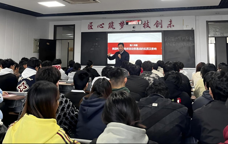 11月11日,党委委员、副校长姚庆文为24计算机网络专业学生讲授“美国特朗普政府发动贸易战的实质及影响”专题思政课。姚庆文从美国政治体制与对外行为的特点切入,聚焦特朗普政府发动的对华贸易战,通过对比分析,深刻揭示美国“公平贸易”为名、行单边保护之实的实质,阐明贸易战对中美两国乃至全球经济产生的深远影响勉励学生清醒认识国际形势的复杂性,树立正确历史观、大局观,坚定“四个自信”,将个人成长融入国家发展大局,勤学笃行、奋发有为,为实现中华民族伟大复兴贡献智慧与力量。