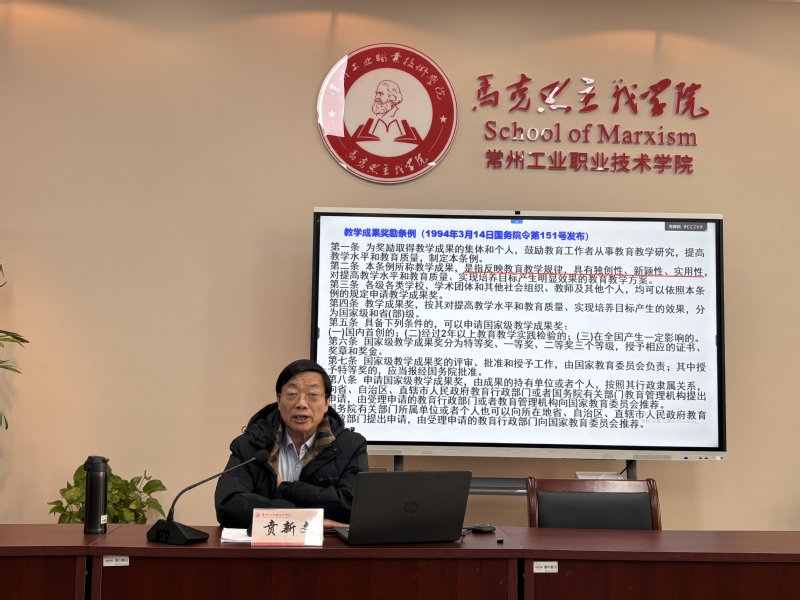 为进一步提升思政课教学质量,深化教学改革,积极培育高水平思政课教学成果,12月31日,马克思主义学院举办思政课教学成果奖培育专题培训会。本次培训特邀常州市武进区学校和教师发展中心教研员贲新文担任主讲嘉宾,为全院教师带来了一场内容丰富、指导性强的专题讲座。