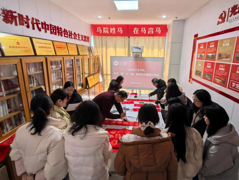 一副副红联,翰墨飘香,传递着思想的力量;一份份暖“包”,情意真挚,承载着集体的温情。此次主题党日活动,是马克思主义学院推动理论学习形式创新、提升组织生活实效的一次生动实践。通过将春节传统习俗与党的创新理论学习宣传相结合,活动不仅营造了欢乐祥和、积极向上的节日文化氛围,更深化了教师们对思政课教学“入脑入心”“润物无声”的实践体悟,进一步凝聚了教师们为党育人、为国育才的思想自觉与行动共识。(作者:王莉)