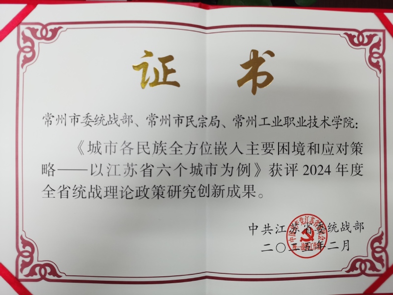 日前,在2025年全省统战部长工作会议上,省委统战部通报了2024年度表彰名单,马克思主义学院邱程团队与常州市委统战部联合报送的《城市各民族全方位嵌入的主要困境和应对策略——以江苏省6个城市为例》、马克思主义学院王石团队与常州市经开区党群工作部联合报送的《留学归国人员助力地方发展的社会支持系统研究——以增强欧美同学会组织活力为基础》荣获2024年度全省统战理论政策研究创新成果奖。创新成果奖是全省统战系统理论政策研究成果的集中展现。本次评选,全省各设区市、省属机关企事业高校、民主党派和工商联共报送成果200余篇。常州市共推荐3篇(其中,我校教师主笔两篇)。经过省级专家评审,全省共计30篇研究成果获奖。我校教师主笔的两篇论文均获奖。